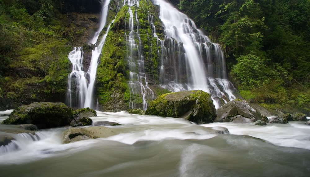The exposure times were about half a second for the larger fall, and up to six seconds for the little creek at f/16. I also used a polarizer to cut through the water reflections.